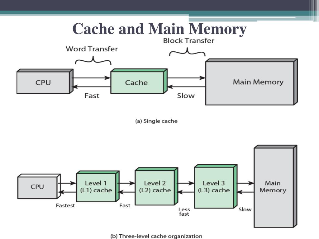When the processor attempts to read a word of memory, a check is made to determine if the word is in the cache. • If so, the word is delivered to the processor. • If not, a block of main memory, consisting of some fixed number of words, is read into the cache and then the word is delivered to the processor. • There is multiple levels of cache. The L2 cache is slower and typically larger than the L1 cache, and the L3 cache is slower and typically larger than the L2 cache.