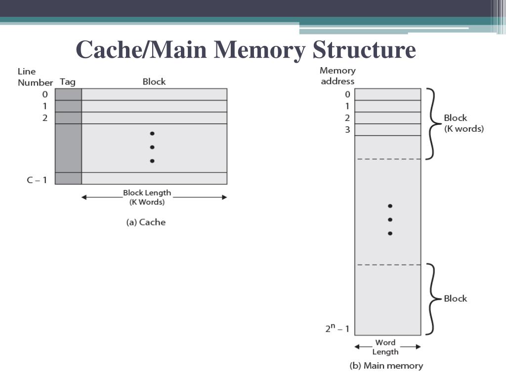 Main memory consists of up to 2n addressable words, with each word having a unique n-bit address. • For mapping purposes, this memory is considered to consist of a number of fixed length blocks of K words each. • There are M=2n/K blocks in main memory. • The cache consists of m blocks, called lines. • Each line contains K words, plus a tag of a few bits. Each line also includes control bits (not shown), such as a bit to indicate whether the line has been modified since being loaded into the cache. • The length of a line, not including tag and control bits, is the line size. • The line size may be as small as 32 bits, with each “word” being a single byte; in this case the line size is 4 bytes.