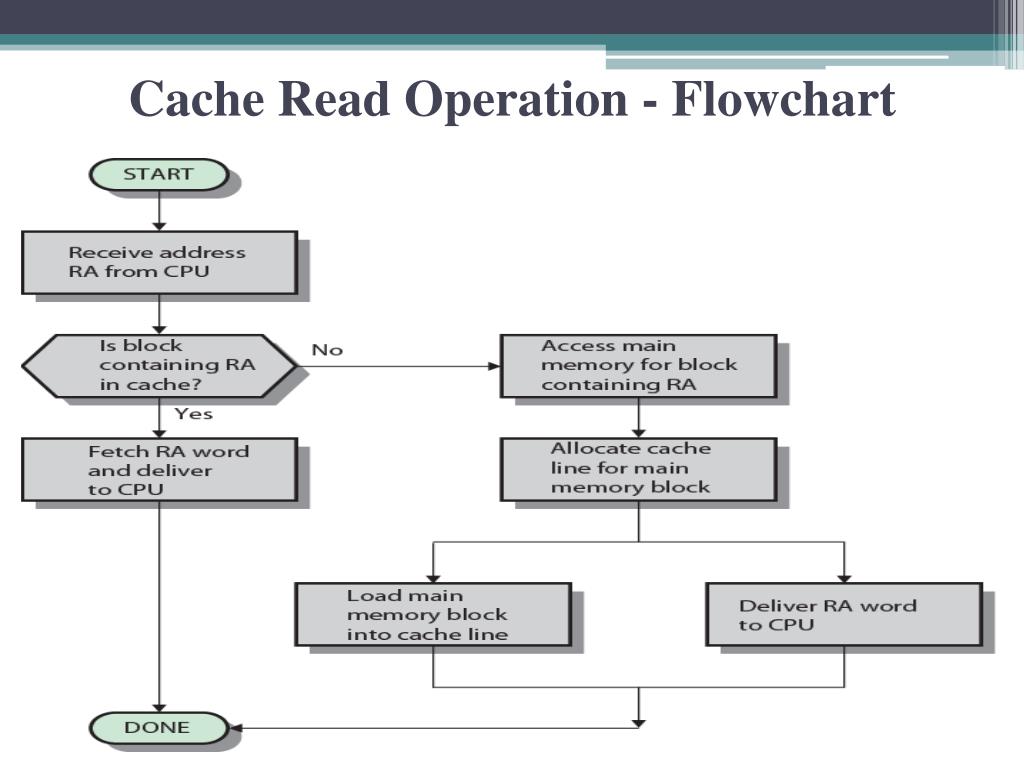 Cache operation – overview • CPU requests contents of memory location. • Check cache for this data. • If present, get from cache (fast). • If not present, read required block from main memory to cache. • Then deliver from cache to CPU. • Cache includes tags to identify which block of main memory is in each cache slot. • RA is referred to the read address of a word to be read.