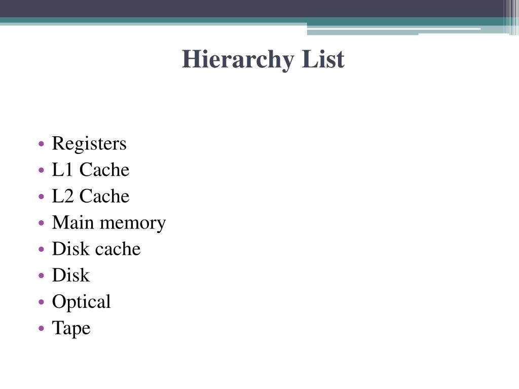 Hierarchy List • Registers • L1 Cache • L2 Cache • Main memory • Disk cache • Disk • Optical • Tape