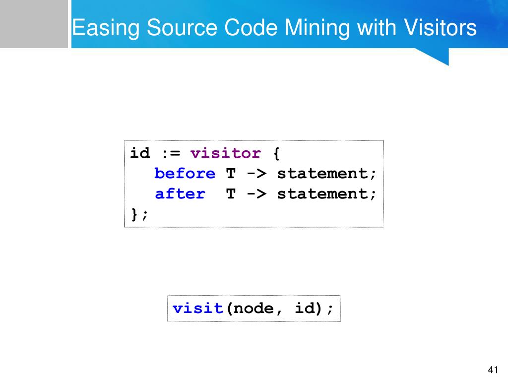 Easing Source Code Mining with Visitors id := visitor { before T -> statement; after T -> statement; }; visit(node, id);