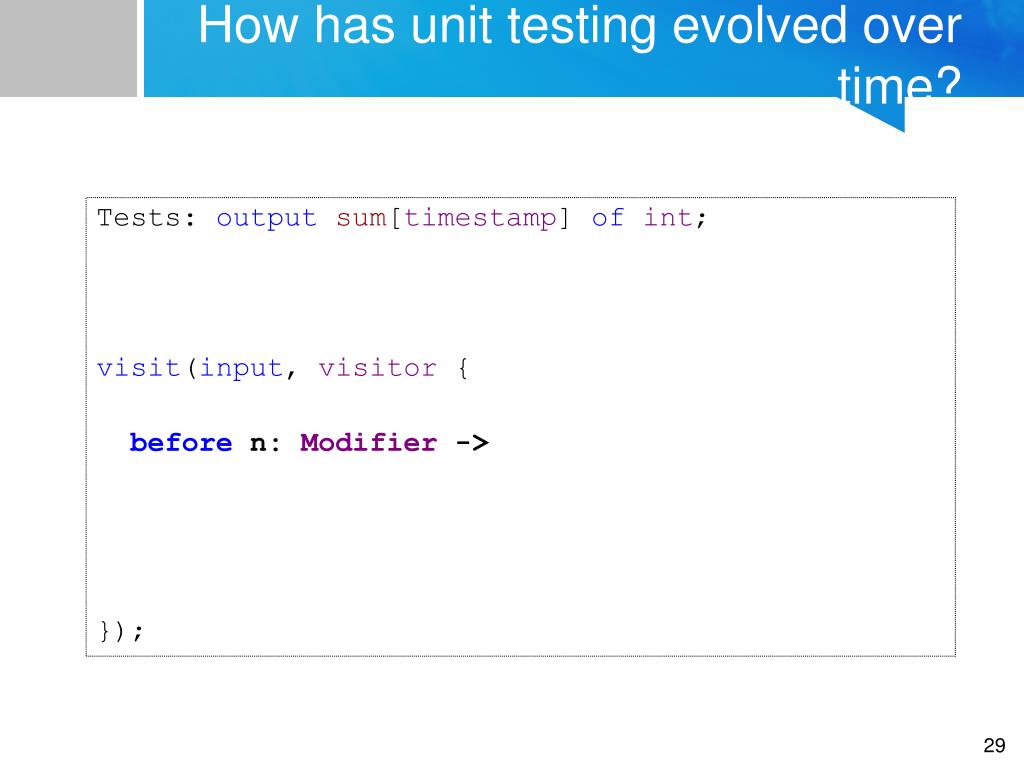 How has unit testing evolved over time? Tests: output sum[timestamp] of int; visit(input, visitor { });
