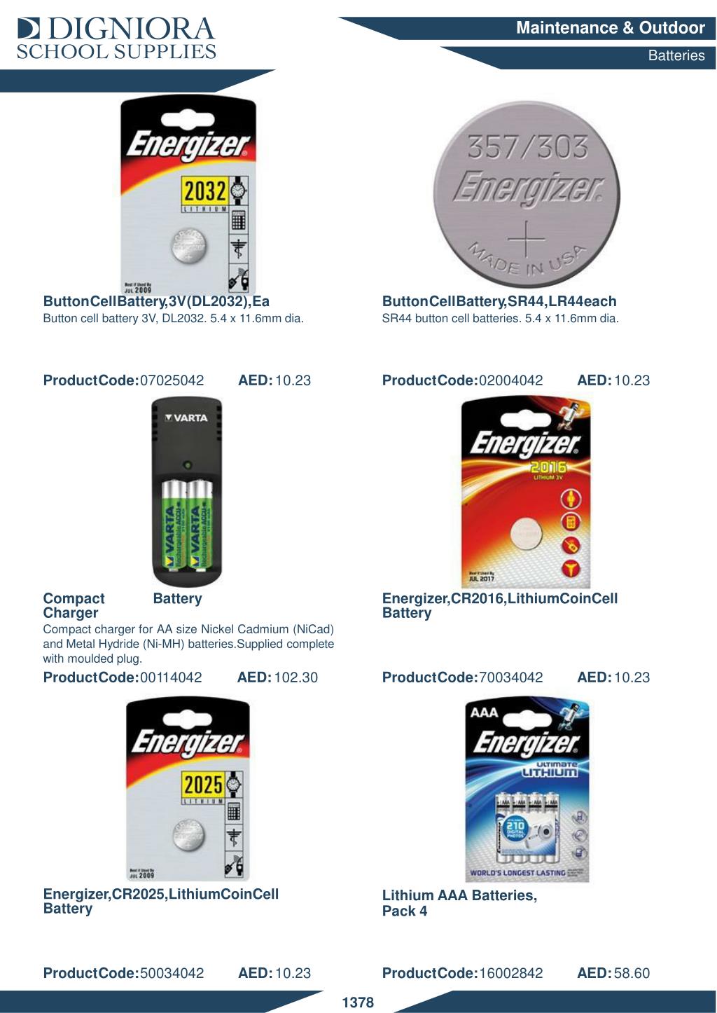 Maintenance&Outdoor Batteries ButtonCellBattery,3V(DL2032),Ea Buttoncellbattery3V,DL2032.5.4x11.6mmdia. ButtonCellBattery,SR44,LR44each SR44buttoncellbatteries.5.4x11.6mmdia. ProductCode:07025042 AED:10.23 ProductCode:02004042 AED:10.23 CompactBatteryCharger CompactchargerforAAsizeNickelCadmium(NiCad)andMetalHydride(Ni-MH)batteries.Suppliedcompletewithmouldedplug. Energizer,CR2016,LithiumCoinCellBattery ProductCode:00114042 AED:102.30 ProductCode:70034042 AED:10.23 Energizer,CR2025,LithiumCoinCellBattery LithiumAAABatteries,Pack4 ProductCode:50034042 AED:10.23 ProductCode:16002842 AED:58.60 1378