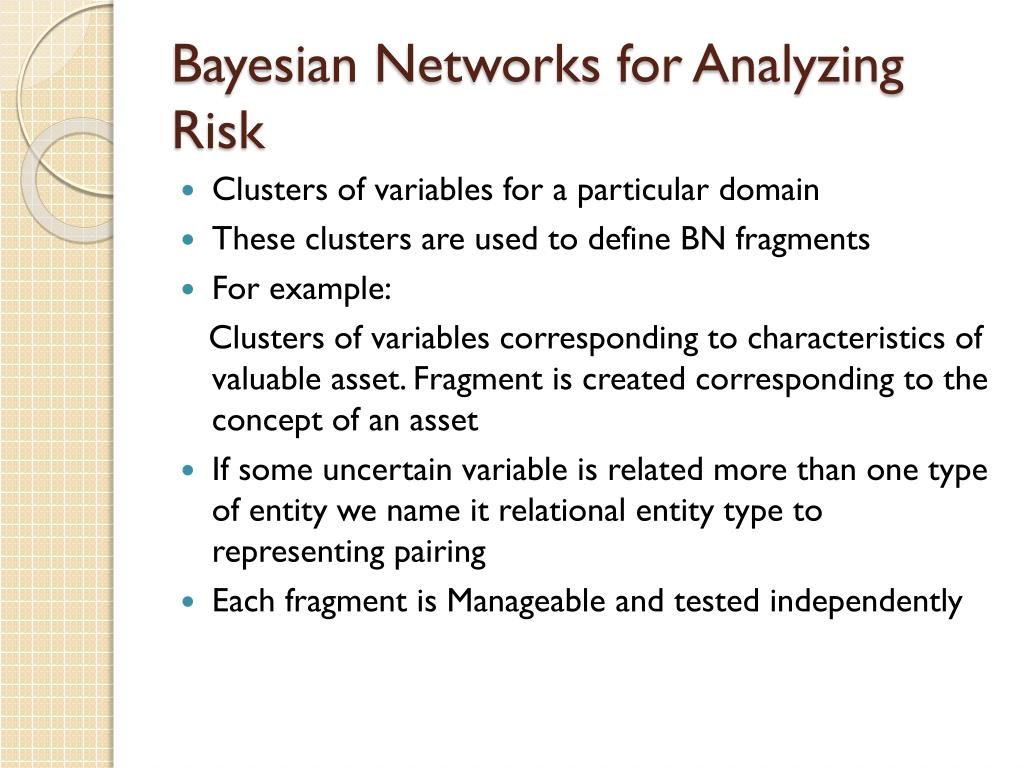 Bayesian Networks for Analyzing Risk • Clusters of variables for a particular domain • These clusters are used to define BN fragments • For example: Clusters of variables corresponding to characteristics of valuable asset. Fragment is created corresponding to the concept of an asset • If some uncertain variable is related more than one type of entity we name it relational entity type to representing pairing • Each fragment is Manageable and tested independently