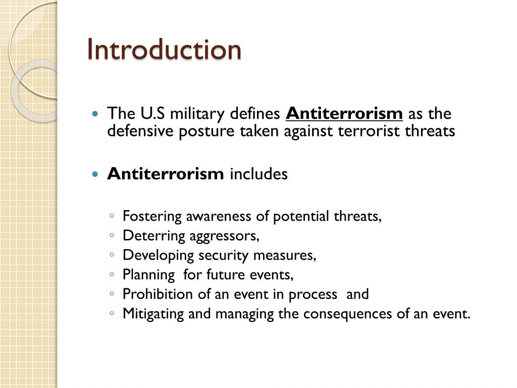 Introduction • The U.S military defines Antiterrorism as the defensive posture taken against terrorist threats • Antiterrorism includes • Fostering awareness of potential threats, • Deterring aggressors, • Developing security measures, • Planning for future events, • Prohibition of an event in process and • Mitigating and managing the consequences of an event.