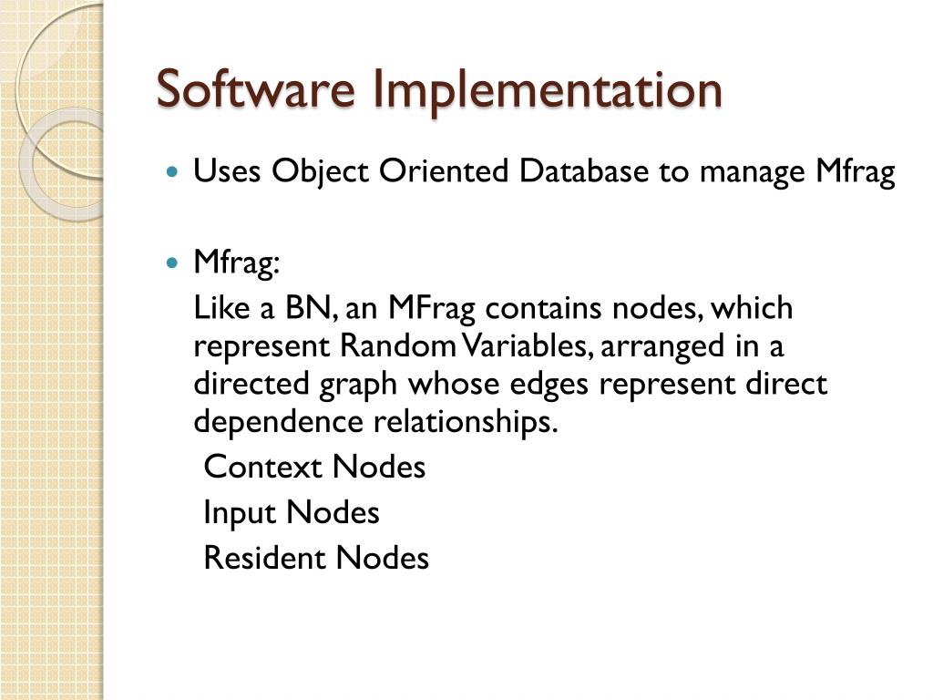 Software Implementation • Uses Object Oriented Database to manage Mfrag • Mfrag: Like a BN, an MFrag contains nodes, which represent Random Variables, arranged in a directed graph whose edges represent direct dependence relationships. Context Nodes Input Nodes Resident Nodes