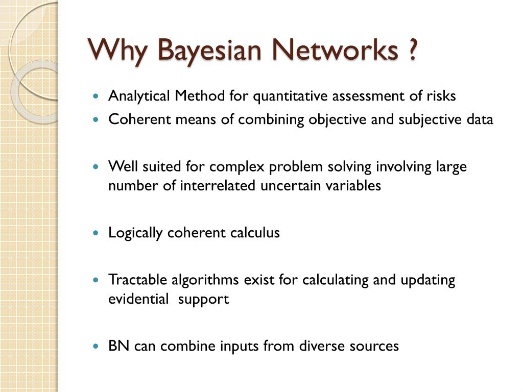 Why Bayesian Networks ? • Analytical Method for quantitative assessment of risks • Coherent means of combining objective and subjective data • Well suited for complex problem solving involving large number of interrelated uncertain variables • Logically coherent calculus • Tractable algorithms exist for calculating and updating evidential support • BN can combine inputs from diverse sources