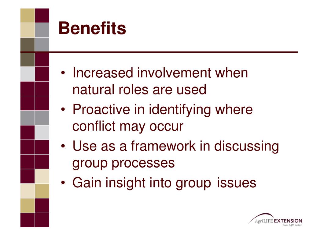 Benefits • Increased involvement when natural roles are used • Proactive in identifying where conflict may occur • Use as a framework in discussing group processes • Gain insight into group issues