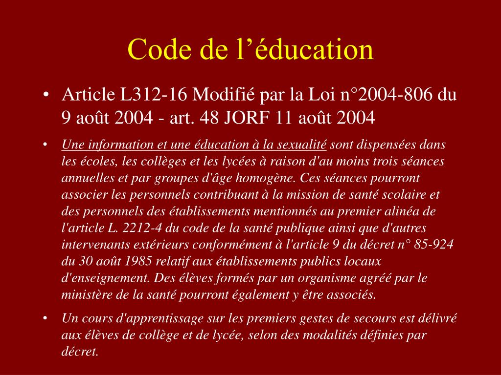 Code de l’éducation • Article L312-16 Modifié par la Loi n°2004-806 du 9 août 2004 - art. 48 JORF 11 août 2004 • Une information et une éducation à la sexualité sont dispensées dans les écoles, les collèges et les lycées à raison d'au moins trois séances annuelles et par groupes d'âge homogène. Ces séances pourront associer les personnels contribuant à la mission de santé scolaire et des personnels des établissements mentionnés au premier alinéa de l'article L. 2212-4 du code de la santé publique ainsi que d'autres intervenants extérieurs conformément à l'article 9 du décret n° 85-924 du 30 août 1985 relatif aux établissements publics locaux d'enseignement. Des élèves formés par un organisme agréé par le ministère de la santé pourront également y être associés. • Un cours d'apprentissage sur les premiers gestes de secours est délivré aux élèves de collège et de lycée, selon des modalités définies par décret.