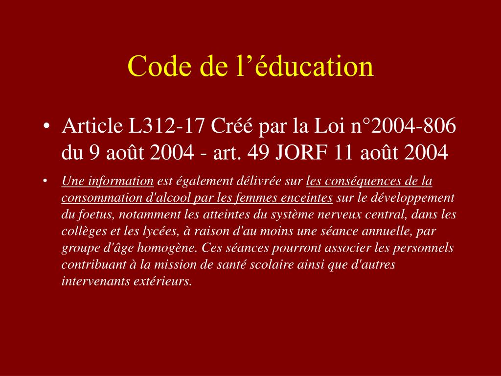 Code de l’éducation • Article L312-17 Créé par la Loi n°2004-806 du 9 août 2004 - art. 49 JORF 11 août 2004 • Une information est également délivrée sur les conséquences de la consommation d'alcool par les femmes enceintes sur le développement du foetus, notamment les atteintes du système nerveux central, dans les collèges et les lycées, à raison d'au moins une séance annuelle, par groupe d'âge homogène. Ces séances pourront associer les personnels contribuant à la mission de santé scolaire ainsi que d'autres intervenants extérieurs.