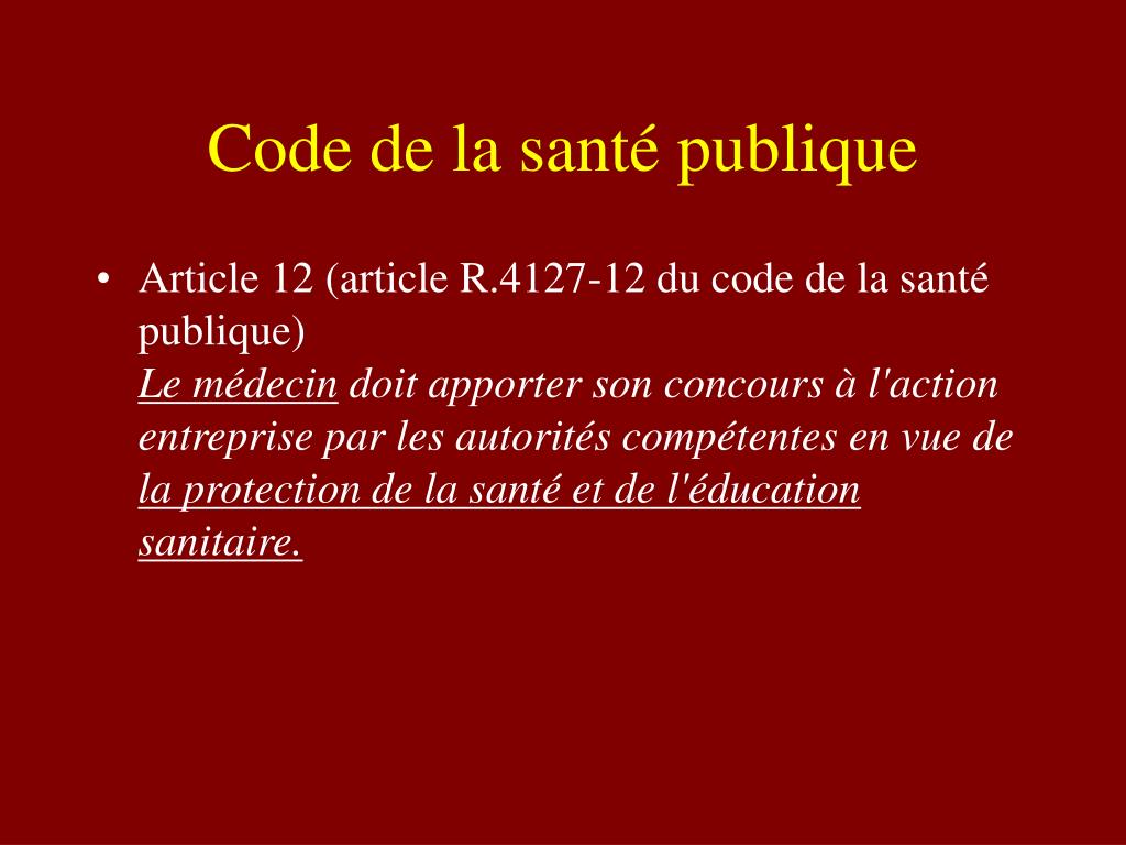 Code de la santé publique • Article 12 (article R.4127-12 du code de la santé publique)Le médecin doit apporter son concours à l'action entreprise par les autorités compétentes en vue de la protection de la santé et de l'éducation sanitaire.
