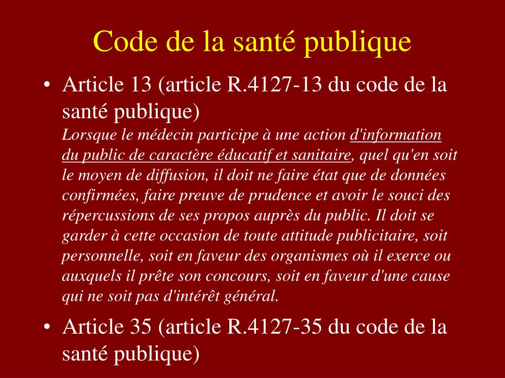 Code de la santé publique • Article 13 (article R.4127-13 du code de la santé publique)Lorsque le médecin participe à une action d'information du public de caractère éducatif et sanitaire, quel qu'en soit le moyen de diffusion, il doit ne faire état que de données confirmées, faire preuve de prudence et avoir le souci des répercussions de ses propos auprès du public. Il doit se garder à cette occasion de toute attitude publicitaire, soit personnelle, soit en faveur des organismes où il exerce ou auxquels il prête son concours, soit en faveur d'une cause qui ne soit pas d'intérêt général. • Article 35 (article R.4127-35 du code de la santé publique)