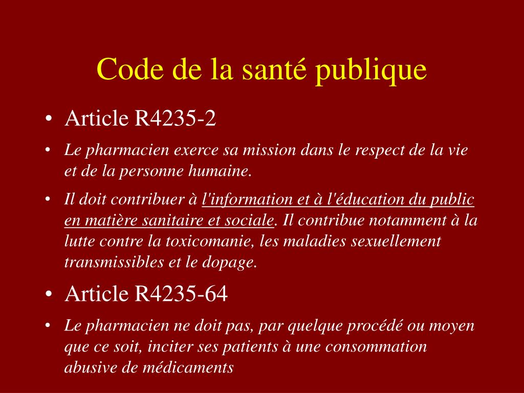 Code de la santé publique • Article R4235-2 • Le pharmacien exerce sa mission dans le respect de la vie et de la personne humaine. • Il doit contribuer à l'information et à l'éducation du public en matière sanitaire et sociale. Il contribue notamment à la lutte contre la toxicomanie, les maladies sexuellement transmissibles et le dopage. • Article R4235-64 • Le pharmacien ne doit pas, par quelque procédé ou moyen que ce soit, inciter ses patients à une consommation abusive de médicaments