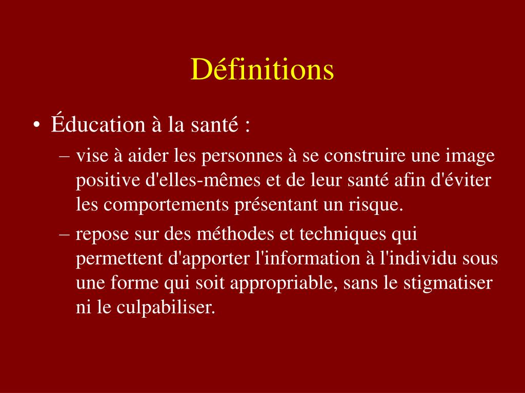 Définitions • Éducation à la santé : • vise à aider les personnes à se construire une image positive d'elles-mêmes et de leur santé afin d'éviter les comportements présentant un risque. • repose sur des méthodes et techniques qui permettent d'apporter l'information à l'individu sous une forme qui soit appropriable, sans le stigmatiser ni le culpabiliser.