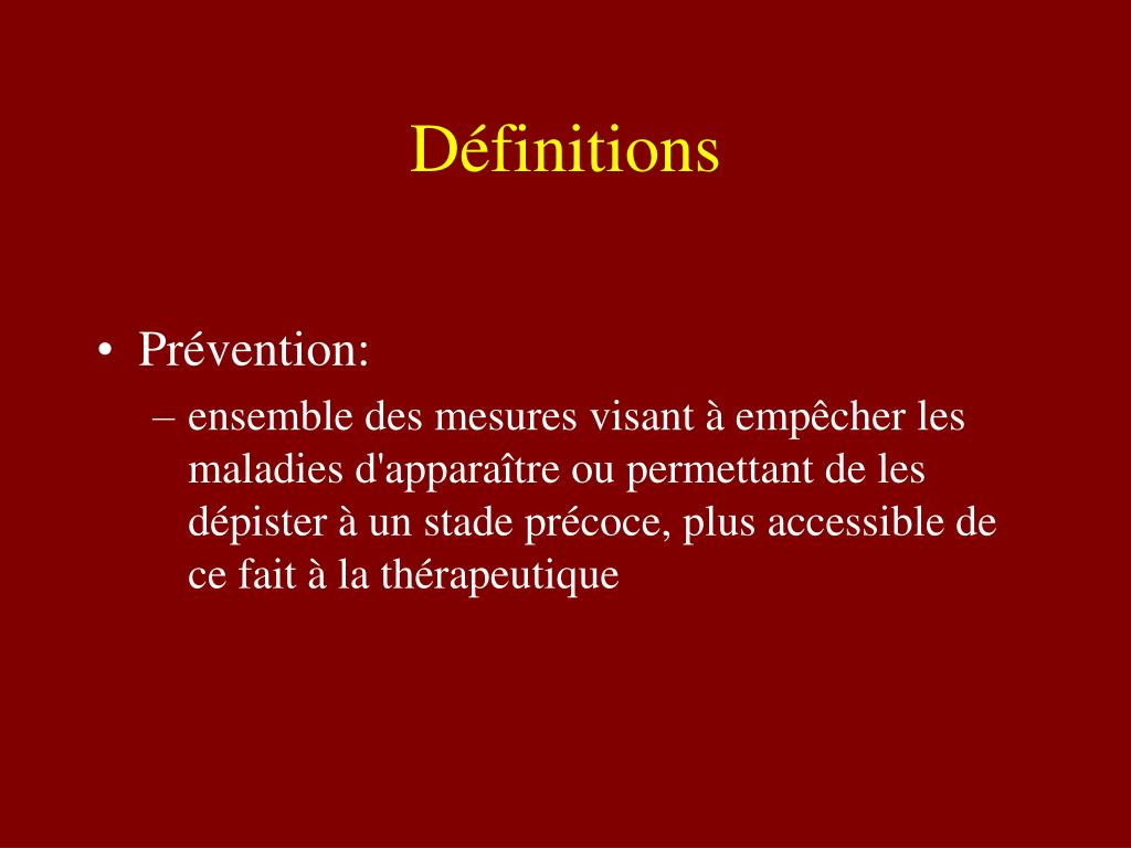 Définitions • Prévention: • ensemble des mesures visant à empêcher les maladies d'apparaître ou permettant de les dépister à un stade précoce, plus accessible de ce fait à la thérapeutique