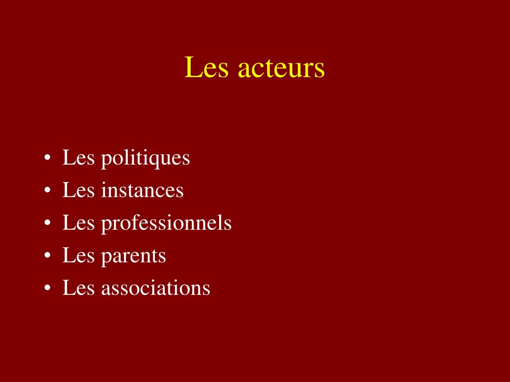 Les acteurs • Les politiques • Les instances • Les professionnels • Les parents • Les associations