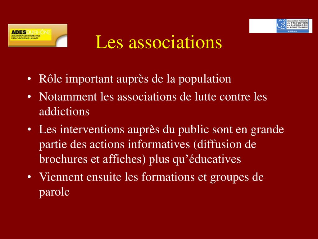 Les associations • Rôle important auprès de la population • Notamment les associations de lutte contre les addictions • Les interventions auprès du public sont en grande partie des actions informatives (diffusion de brochures et affiches) plus qu’éducatives • Viennent ensuite les formations et groupes de parole