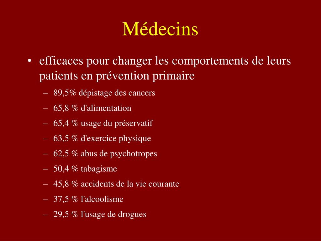 Médecins • efficaces pour changer les comportements de leurs patients en prévention primaire • 89,5% dépistage des cancers • 65,8 % d'alimentation • 65,4 % usage du préservatif • 63,5 % d'exercice physique • 62,5 % abus de psychotropes • 50,4 % tabagisme • 45,8 % accidents de la vie courante • 37,5 % l'alcoolisme • 29,5 % l'usage de drogues