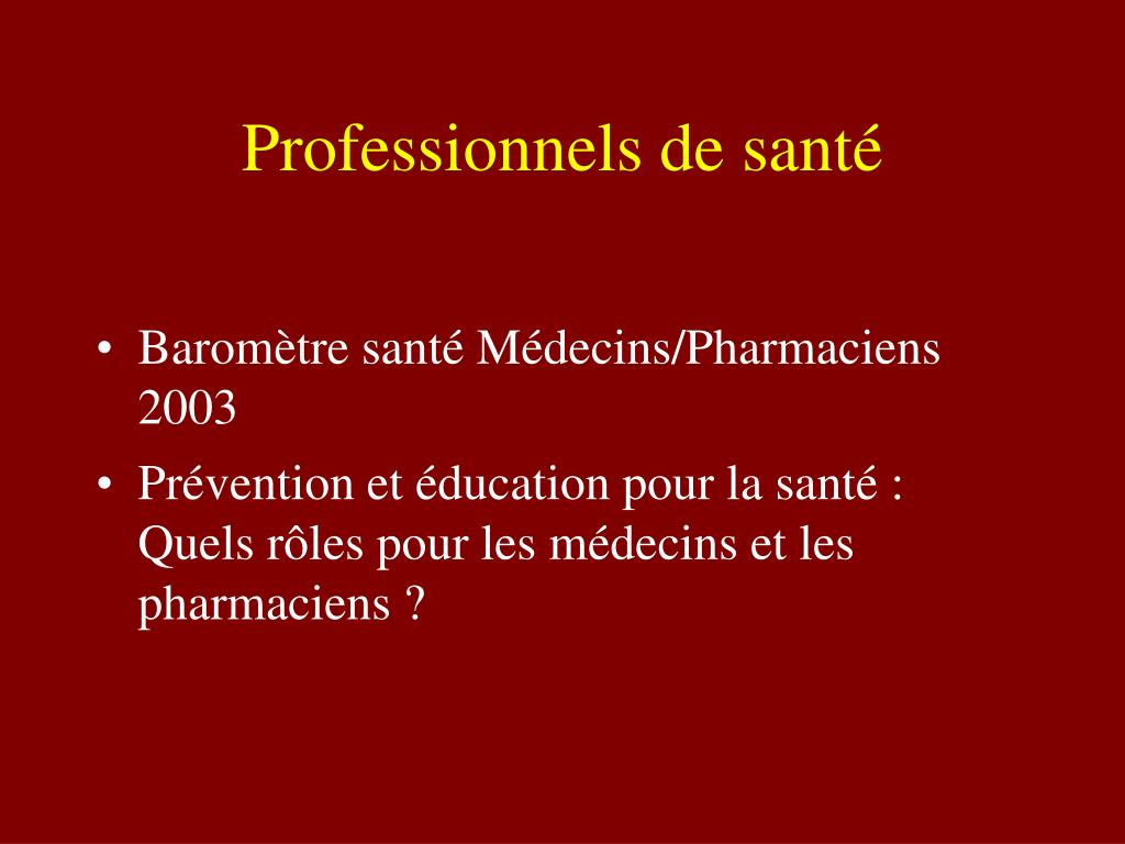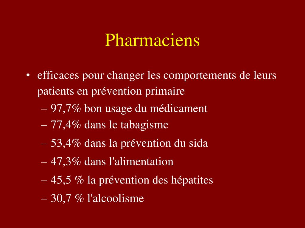 Pharmaciens • efficaces pour changer les comportements de leurs patients en prévention primaire • 97,7% bon usage du médicament • 77,4% dans le tabagisme • 53,4% dans la prévention du sida • 47,3% dans l'alimentation • 45,5 % la prévention des hépatites • 30,7 % l'alcoolisme