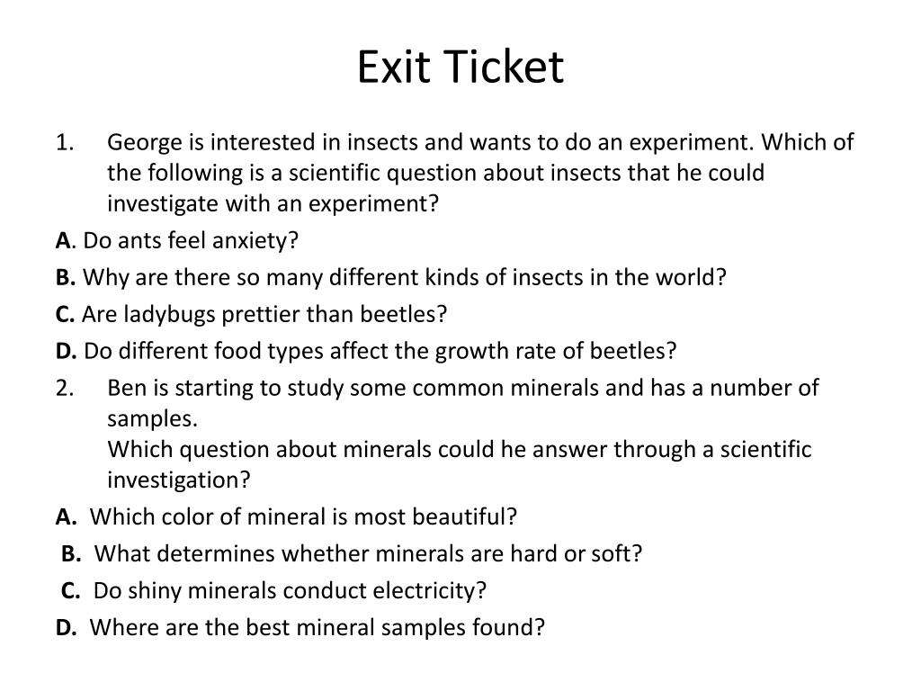 Exit Ticket • George is interested in insects and wants to do an experiment. Which of the following is a scientific question about insects that he could investigate with an experiment? A. Do ants feel anxiety? B. Why are there so many different kinds of insects in the world? C. Are ladybugs prettier than beetles? D. Do different food types affect the growth rate of beetles? • Ben is starting to study some common minerals and has a number of samples.Which question about minerals could he answer through a scientific investigation? A. Which color of mineral is most beautiful? B. What determines whether minerals are hard or soft? C. Do shiny minerals conduct electricity? D. Where are the best mineral samples found?