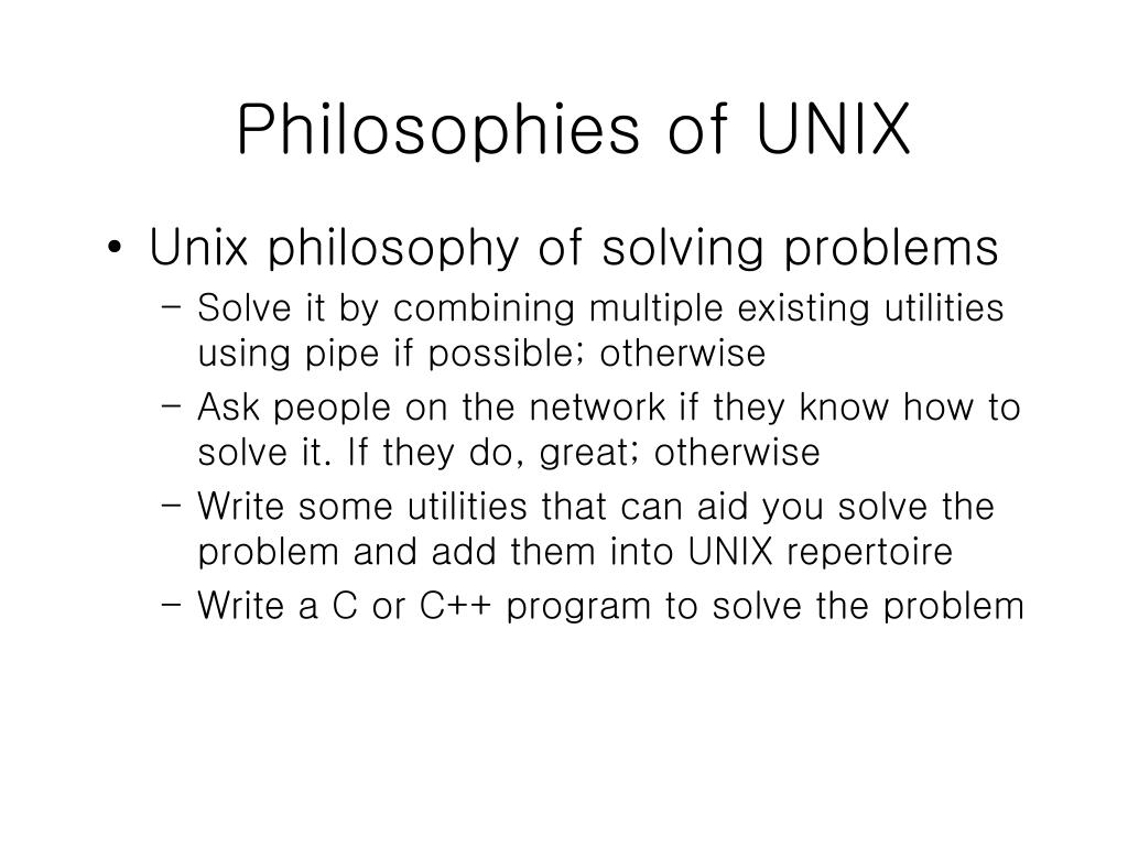 Philosophies of UNIX • Unix philosophy of solving problems • Solve it by combining multiple existing utilities using pipe if possible; otherwise • Ask people on the network if they know how to solve it. If they do, great; otherwise • Write some utilities that can aid you solve the problem and add them into UNIX repertoire • Write a C or C++ program to solve the problem