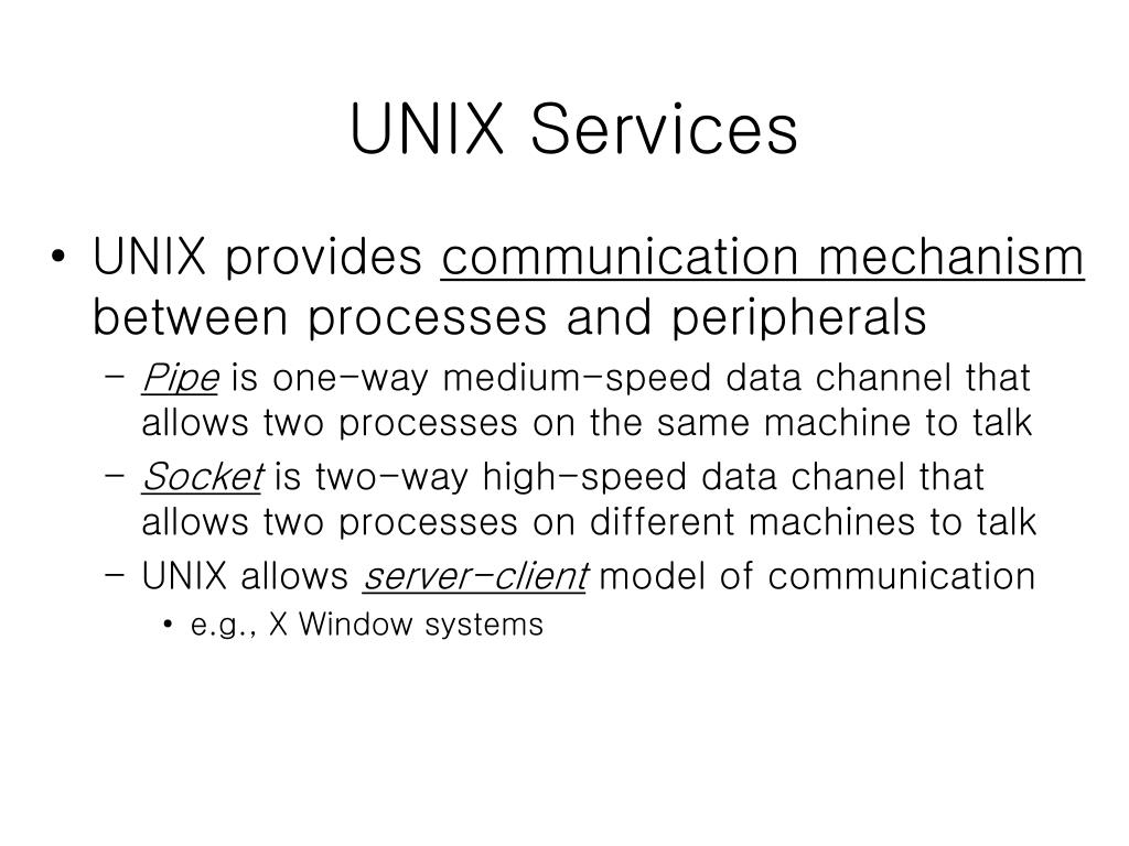 UNIX Services • UNIX provides communication mechanism between processes and peripherals • Pipe is one-way medium-speed data channel that allows two processes on the same machine to talk • Socket is two-way high-speed data chanel that allows two processes on different machines to talk • UNIX allows server-client model of communication • e.g., X Window systems