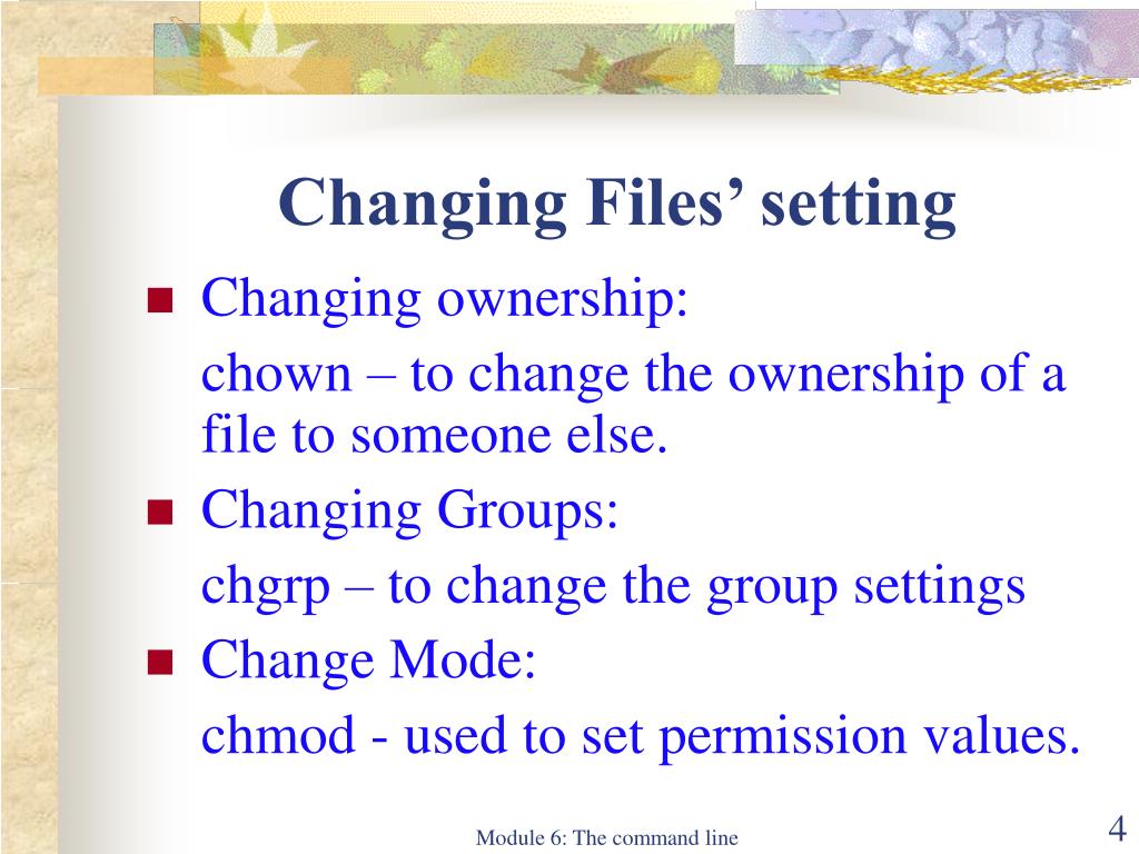 Changing Files’ setting • Changing ownership: chown – to change the ownership of a file to someone else. • Changing Groups: chgrp – to change the group settings • Change Mode: chmod - used to set permission values. Module 6: The command line