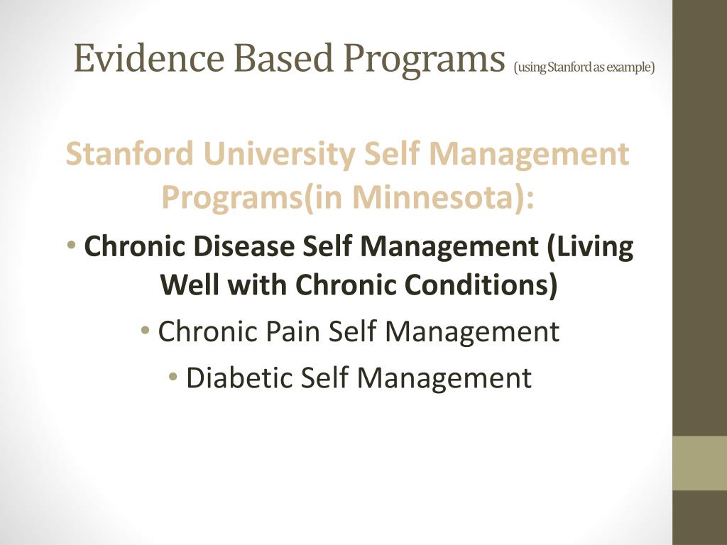 Evidence Based Programs (using Stanford as example) Stanford University Self Management Programs(in Minnesota): • Chronic Disease Self Management (Living Well with Chronic Conditions) • Chronic Pain Self Management • Diabetic Self Management