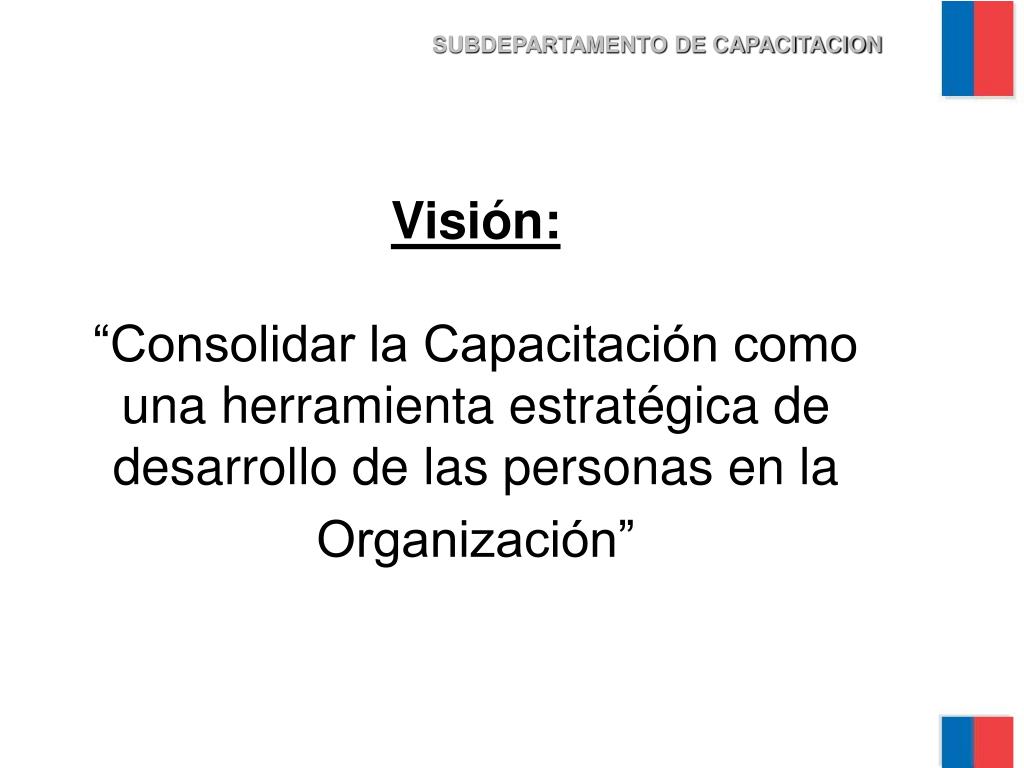 SUBDEPARTAMENTO DE CAPACITACION Visión:“Consolidar la Capacitación como una herramienta estratégica de desarrollo de las personas en la Organización”