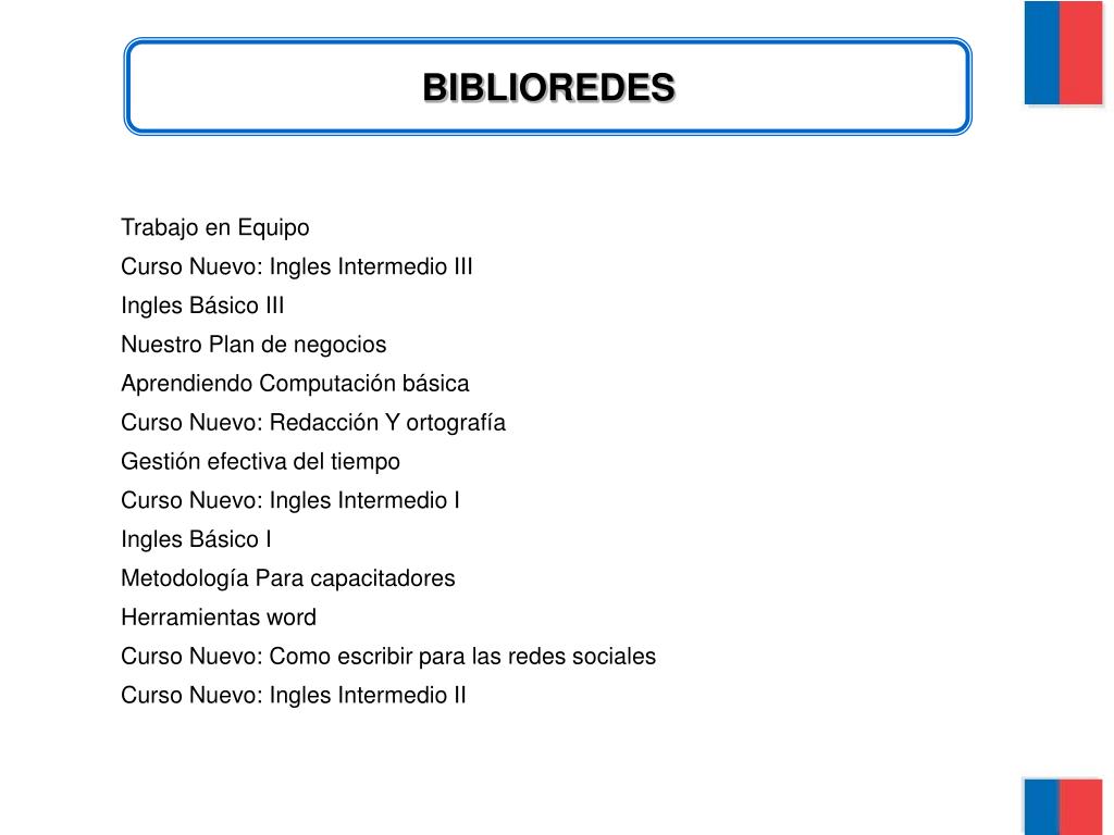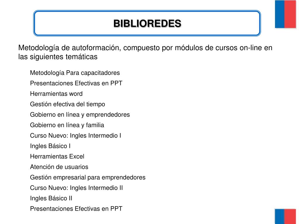 BIBLIOREDES Metodología de autoformación, compuesto por módulos de cursos on-line en las siguientes temáticas