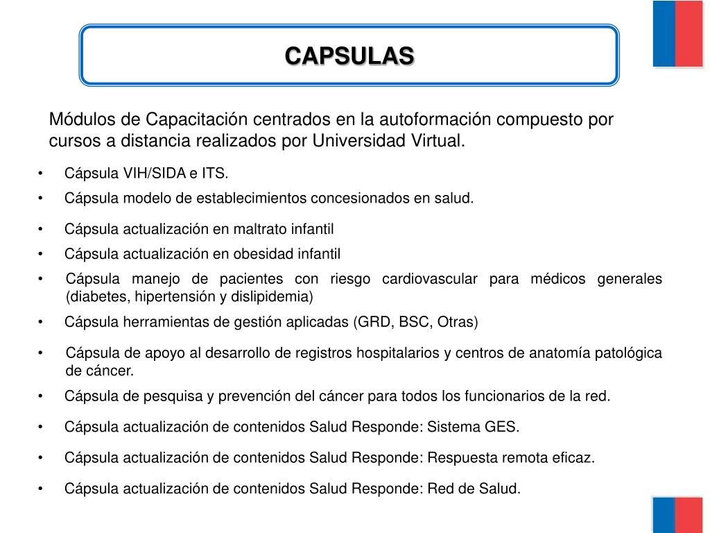 CAPACITACION A DISTANCIA • Se han asignado para el presente año 310 cupos los cuales serán distribuidos en las siguientes temáticas: 11. Salud Buco-Dental Preescolares (PUBLICA) 12. Curso Registros y estadísticas en salud 13. Usuarios y Funcionarios 14. Conociendo y resolviendo los problemas del Usuario. 15. Curso OIRS 16. Modelo de cuidado de personas con enfermedades crónicas 17. Adolescentes 18. Curso SIGGES 19. Desarrollo de la red asistencial a través de diseño e implementación de mecanismos de referencia y contrarreferencia • Salud infantil • Formación de Tutores a Distancia