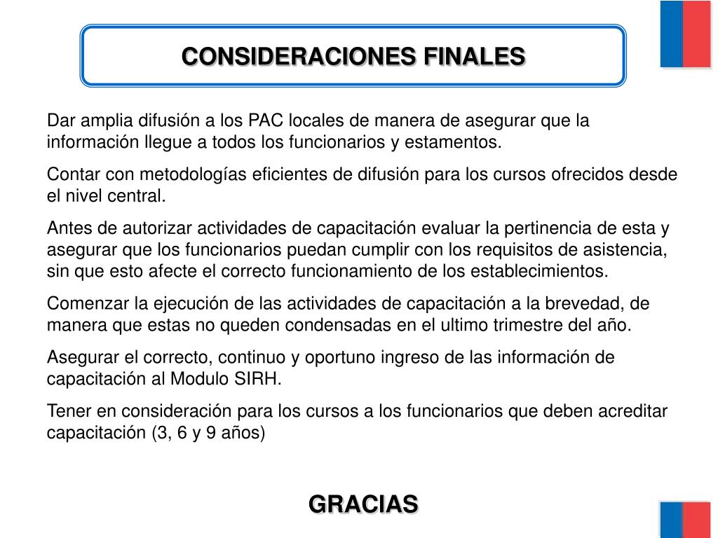 CONSIDERACIONES FINALES • Dar amplia difusión a los PAC locales de manera de asegurar que la información llegue a todos los funcionarios y estamentos. • Contar con metodologías eficientes de difusión para los cursos ofrecidos desde el nivel central. • Antes de autorizar actividades de capacitación evaluar la pertinencia de esta y asegurar que los funcionarios puedan cumplir con los requisitos de asistencia, sin que esto afecte el correcto funcionamiento de los establecimientos. • Comenzar la ejecución de las actividades de capacitación a la brevedad, de manera que estas no queden condensadas en el ultimo trimestre del año. • Asegurar el correcto, continuo y oportuno ingreso de las información de capacitación al Modulo SIRH. • Tener en consideración para los cursos a los funcionarios que deben acreditar capacitación (3, 6 y 9 años) • GRACIAS