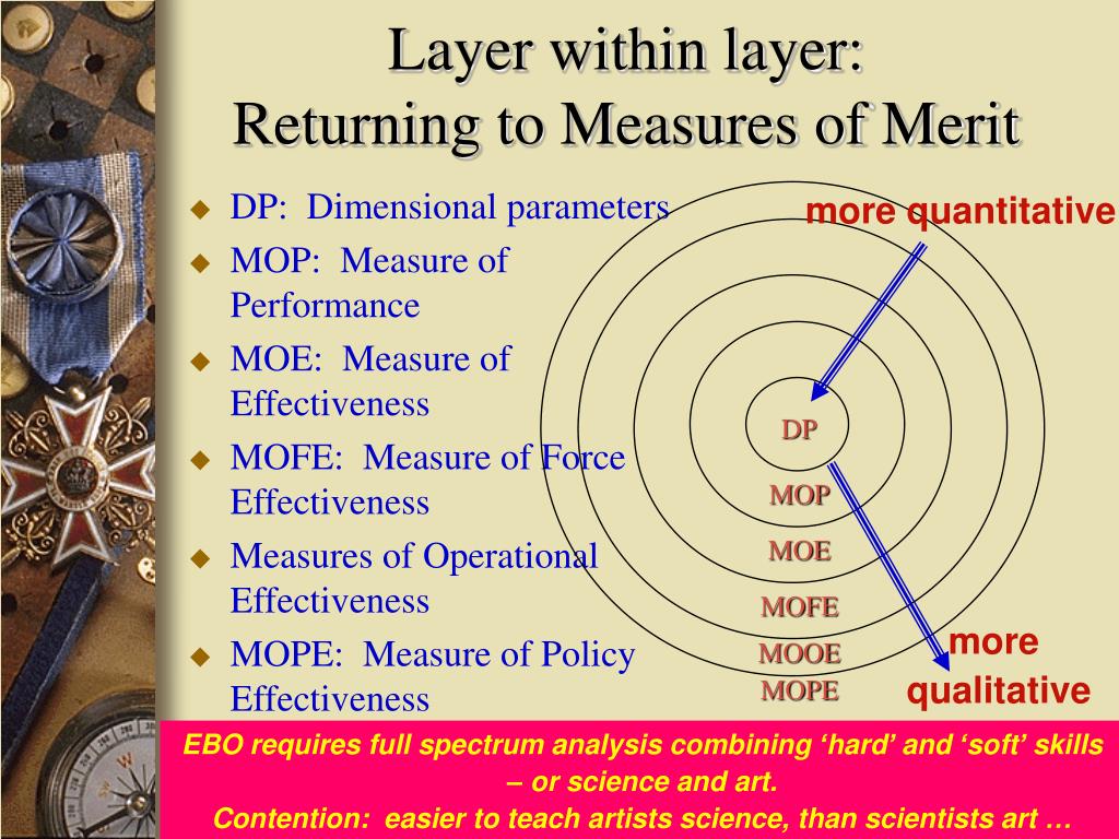 Layer within layer:Thinking about Measures of Merit • DP: Dimensional parameters • MOP: Measure of Performance • MOE: Measure of Effectiveness • MOFE: Measure of Force Effectiveness • Measures of Operational Effectiveness • MOPE: Measure of Policy Effectiveness DP MOP MOE MOFE MOOE MOPE Question: How does this relate to EBO??