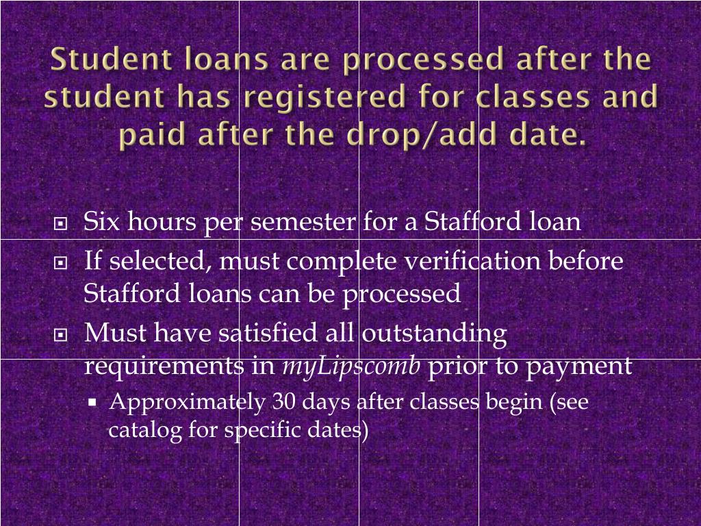 Student loans are processed after the student has registered for classes and paid after the drop/add date. • Six hours per semester for a Stafford loan • If selected, must complete verification before Stafford loans can be processed • Must have satisfied all outstanding requirements in myLipscomb prior to payment • Approximately 30 days after classes begin (see catalog for specific dates)