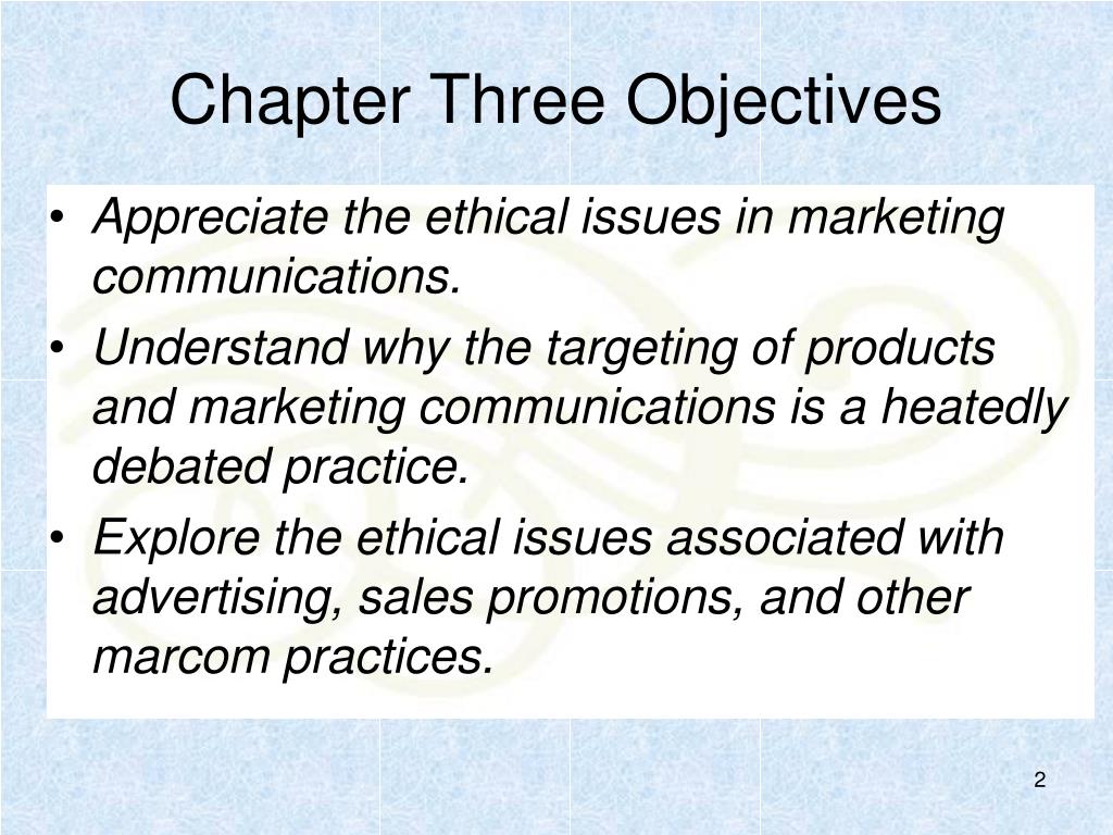 Chapter Three Objectives • Appreciate the ethical issues in marketing communications. • Understand why the targeting of products and marketing communications is a heatedly debated practice. • Explore the ethical issues associated with advertising, sales promotions, and other marcom practices.