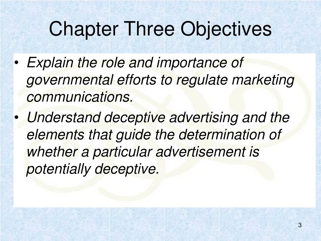 Chapter Three Objectives • Explain the role and importance of governmental efforts to regulate marketing communications. • Understand deceptive advertising and the elements that guide the determination of whether a particular advertisement is potentially deceptive.