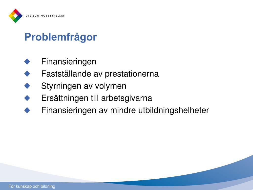 Problemfrågor • Finansieringen • Fastställande av prestationerna • Styrningen av volymen • Ersättningen till arbetsgivarna • Finansieringen av mindre utbildningshelheter