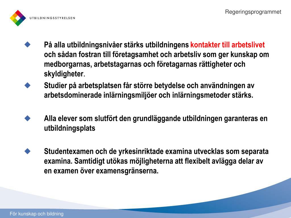Regeringsprogrammet • På alla utbildningsnivåer stärks utbildningens kontakter till arbetslivet och sådan fostran till företagsamhet och arbetsliv som ger kunskap om medborgarnas, arbetstagarnas och företagarnas rättigheter och skyldigheter. • Studier på arbetsplatsen får större betydelse och användningen av arbetsdominerade inlärningsmiljöer och inlärningsmetoder stärks. • Alla elever som slutfört den grundläggande utbildningen garanteras en utbildningsplats • Studentexamen och de yrkesinriktade examina utvecklas som separata examina. Samtidigt utökas möjligheterna att flexibelt avlägga delar av en examen över examensgränserna.