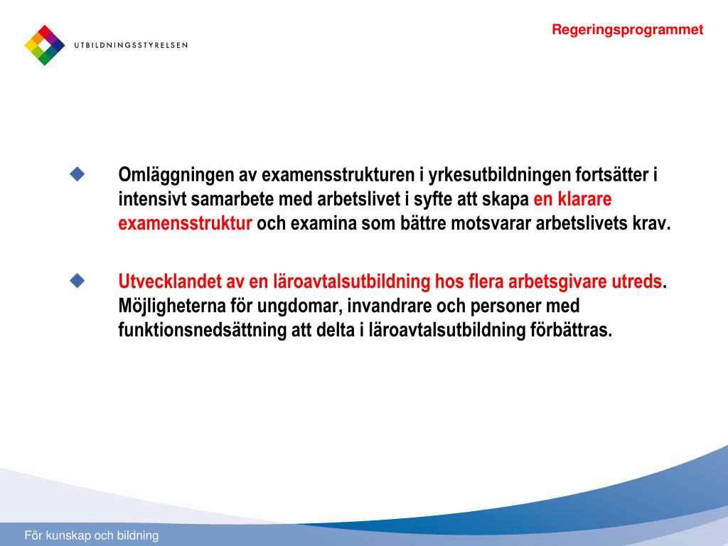 Regeringsprogrammet • Omläggningen av examensstrukturen i yrkesutbildningen fortsätter i intensivt samarbete med arbetslivet i syfte att skapa en klarare examensstruktur och examina som bättre motsvarar arbetslivets krav. • Utvecklandet av en läroavtalsutbildning hos flera arbetsgivare utreds. Möjligheterna för ungdomar, invandrare och personer med funktionsnedsättning att delta i läroavtalsutbildning förbättras.