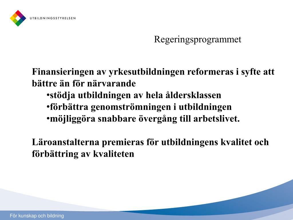Regeringsprogrammet • Finansieringen av yrkesutbildningen reformeras i syfte att bättre än för närvarande • stödja utbildningen av hela åldersklassen • förbättra genomströmningen i utbildningen • möjliggöra snabbare övergång till arbetslivet. • Läroanstalterna premieras för utbildningens kvalitet och förbättring av kvaliteten