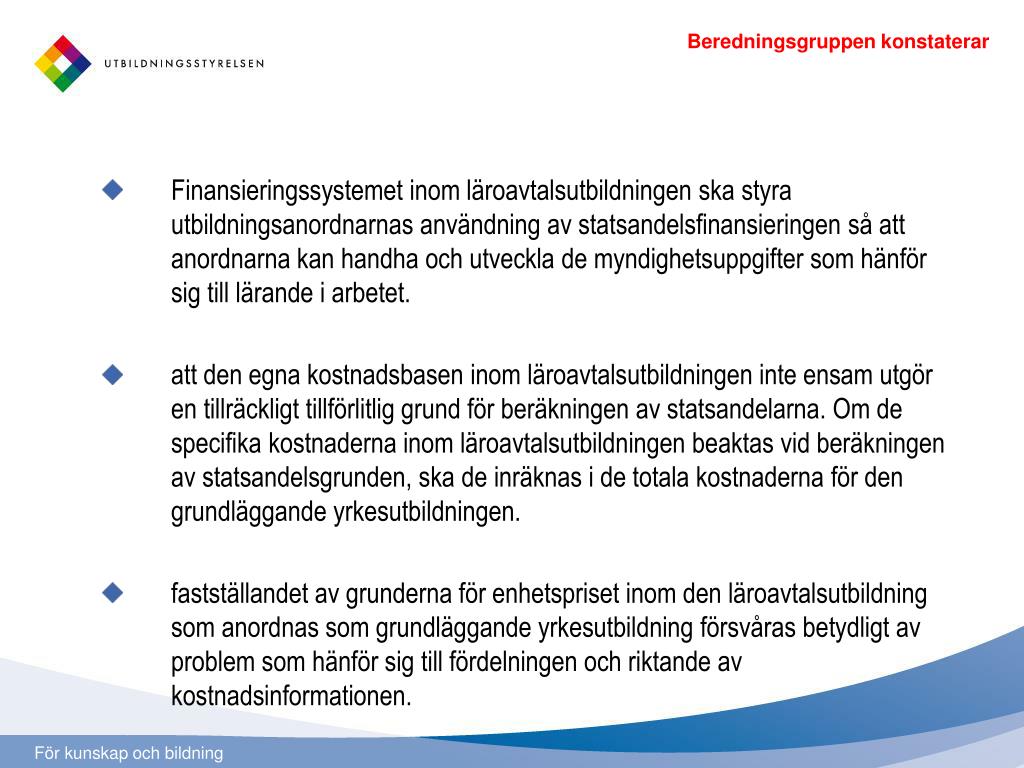 Beredningsgruppen konstaterar • Finansieringssystemet inom läroavtalsutbildningen ska styra utbildningsanordnarnas användning av statsandelsfinansieringen så att anordnarna kan handha och utveckla de myndighetsuppgifter som hänför sig till lärande i arbetet. • att den egna kostnadsbasen inom läroavtalsutbildningen inte ensam utgör en tillräckligt tillförlitlig grund för beräkningen av statsandelarna. Om de specifika kostnaderna inom läroavtalsutbildningen beaktas vid beräkningen av statsandelsgrunden, ska de inräknas i de totala kostnaderna för den grundläggande yrkesutbildningen. • fastställandet av grunderna för enhetspriset inom den läroavtalsutbildning som anordnas som grundläggande yrkesutbildning försvåras betydligt av problem som hänför sig till fördelningen och riktande av kostnadsinformationen.