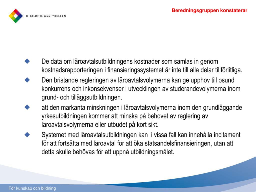 Beredningsgruppen konstaterar • De data om läroavtalsutbildningens kostnader som samlas in genom kostnadsrapporteringen i finansieringssystemet är inte till alla delar tillförlitliga. • Den bristande regleringen av läroavtalsvolymerna kan ge upphov till osund konkurrens och inkonsekvenser i utvecklingen av studerandevolymerna inom grund- och tilläggsutbildningen. • att den markanta minskningen i läroavtalsvolymerna inom den grundläggande yrkesutbildningen kommer att minska på behovet av reglering av läroavtalsvolymerna eller utbudet på kort sikt. • Systemet med läroavtalsutbildningen kan i vissa fall kan innehålla incitament för att fortsätta med läroavtal för att öka statsandelsfinansieringen, utan att detta skulle behövas för att uppnå utbildningsmålet.
