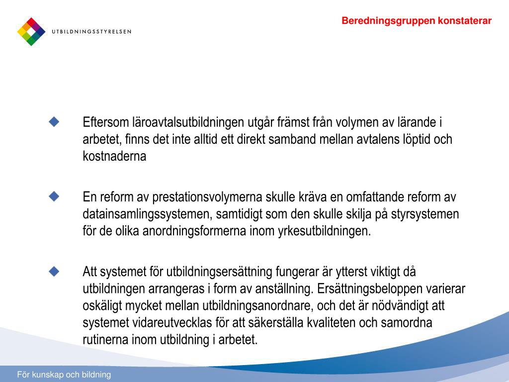 Beredningsgruppen konstaterar • Eftersom läroavtalsutbildningen utgår främst från volymen av lärande i arbetet, finns det inte alltid ett direkt samband mellan avtalens löptid och kostnaderna • En reform av prestationsvolymerna skulle kräva en omfattande reform av datainsamlingssystemen, samtidigt som den skulle skilja på styrsystemen för de olika anordningsformerna inom yrkesutbildningen. • Att systemet för utbildningsersättning fungerar är ytterst viktigt då utbildningen arrangeras i form av anställning. Ersättningsbeloppen varierar oskäligt mycket mellan utbildningsanordnare, och det är nödvändigt att systemet vidareutvecklas för att säkerställa kvaliteten och samordna rutinerna inom utbildning i arbetet.