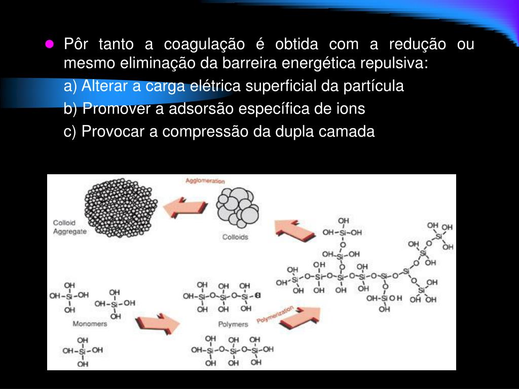 Pôr tanto a coagulação é obtida com a redução ou mesmo eliminação da barreira energética repulsiva: a) Alterar a carga elétrica superficial da partícula b) Promover a adsorsão específica de ions c) Provocar a compressão da dupla camada