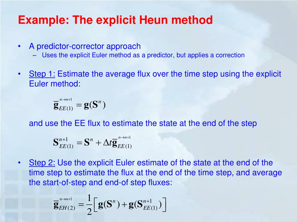 Example: The explicit Heun method • A predictor-corrector approach • Uses the explicit Euler method as a predictor, but applies a correction • Step 1: Estimate the average flux over the time step using the explicit Euler method: and use the EE flux to estimate the state at the end of the step • Step 2: Use the explicit Euler estimate of the state at the end of the time step to estimate the flux at the end of the time step, and average the start-of-step and end-of step fluxes: