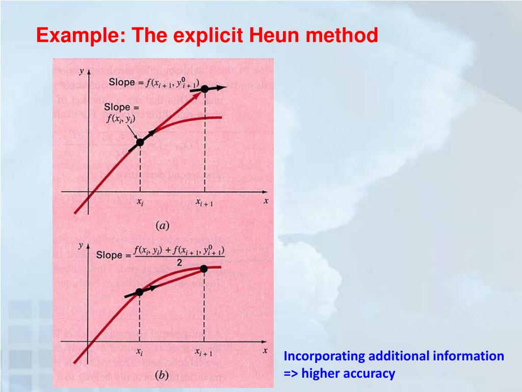 Example: The explicit Heun method Incorporating additional information => higher accuracy