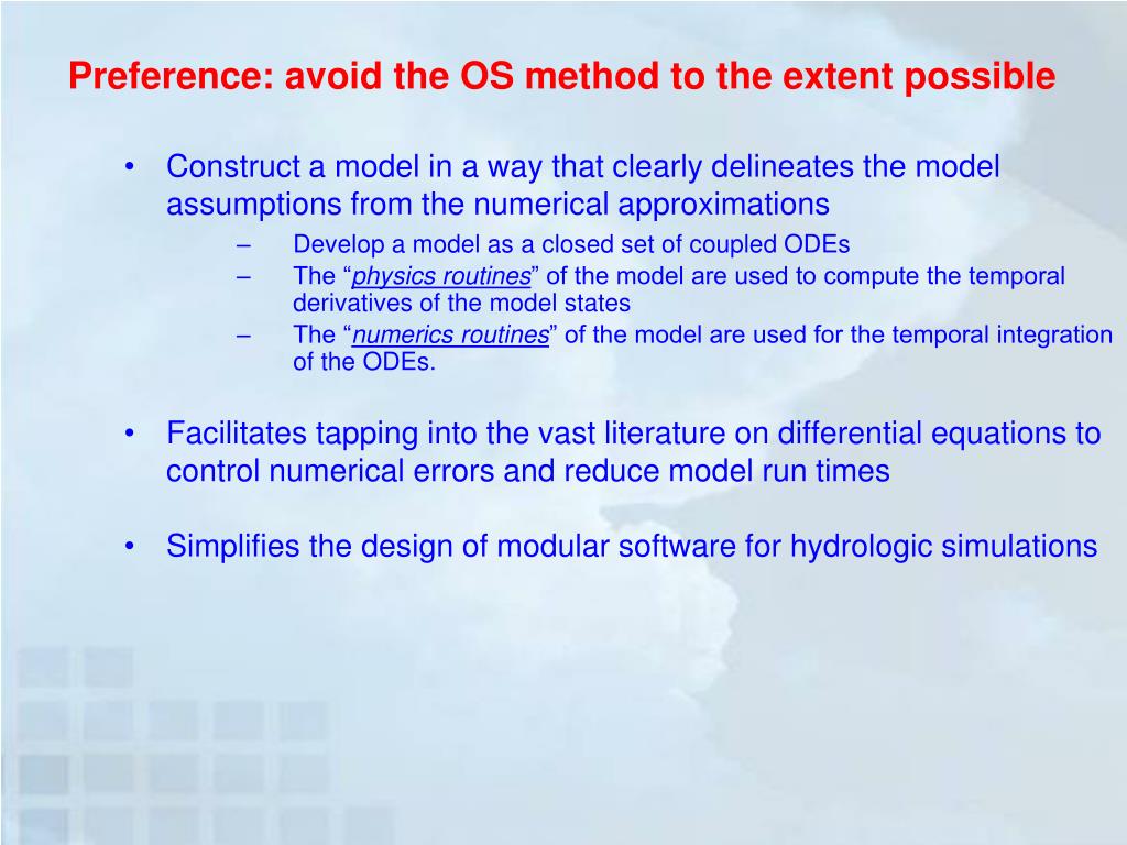 Preference: avoid the OS method to the extent possible • Construct a model in a way that clearly delineates the model assumptions from the numerical approximations • Develop a model as a closed set of coupled ODEs • The “physics routines” of the model are used to compute the temporal derivatives of the model states • The “numerics routines” of the model are used for the temporal integration of the ODEs. • Facilitates tapping into the vast literature on differential equations to control numerical errors and reduce model run times • Simplifies the design of modular software for hydrologic simulations