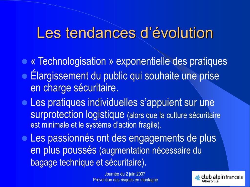 Les tendances d’évolution • « Technologisation » exponentielle des pratiques • Élargissement du public qui souhaite une prise en charge sécuritaire. • Les pratiques individuelles s’appuient sur une surprotection logistique (alors que la culture sécuritaire est minimale et le système d’action fragile). • Les passionnés ont des engagements de plus en plus poussés (augmentation nécessaire du bagage technique et sécuritaire). Journée du 2 juin 2007 Prévention des risques en montagne