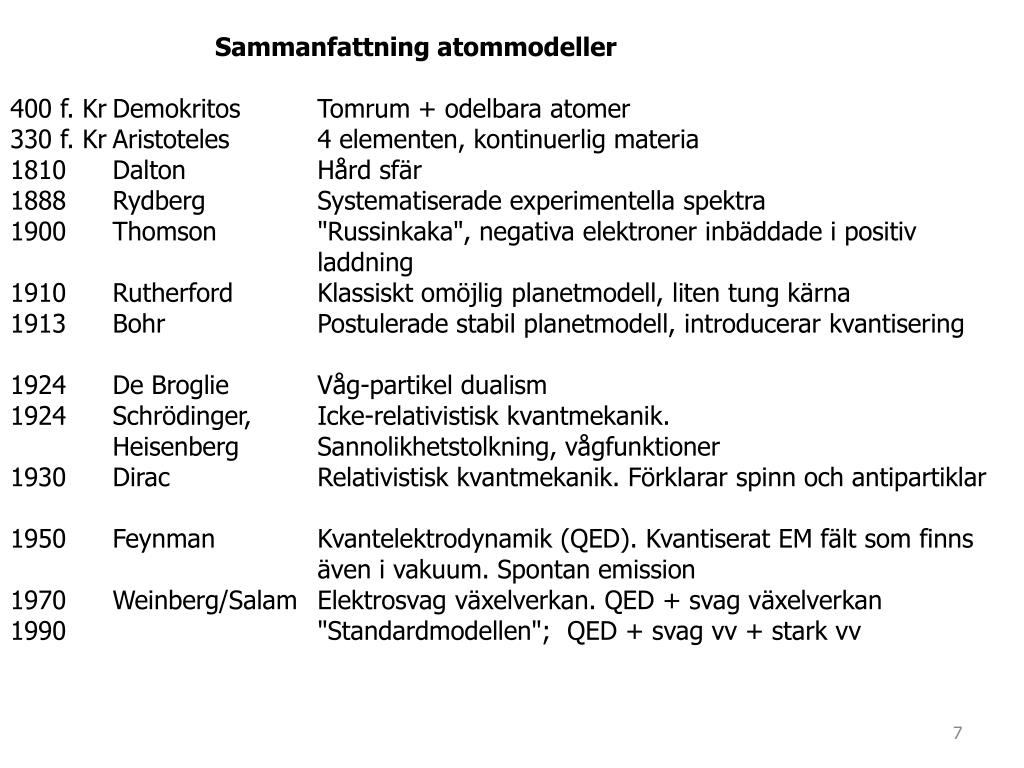 Sammanfattning atommodeller • 400 f. Kr Demokritos Tomrum + odelbara atomer • 330 f. Kr Aristoteles 4 elementen, kontinuerlig materia • 1810 Dalton Hård sfär • 1888 Rydberg Systematiserade experimentella spektra • 1900 Thomson "Russinkaka", negativa elektroner inbäddade i positiv laddning • 1910 Rutherford Klassiskt omöjlig planetmodell, liten tung kärna • 1913 Bohr Postulerade stabil planetmodell, introducerar kvantisering • 1924 De Broglie Våg-partikel dualism • 1924 Schrödinger, Icke-relativistisk kvantmekanik. • Heisenberg Sannolikhetstolkning, vågfunktioner • 1930 Dirac Relativistisk kvantmekanik. Förklarar spinn och antipartiklar • 1950 Feynman Kvantelektrodynamik (QED). Kvantiserat EM fält som finns även i vakuum. Spontan emission • 1970 Weinberg/Salam Elektrosvag växelverkan. QED + svag växelverkan • 1990 "Standardmodellen"; QED + svag vv + stark vv