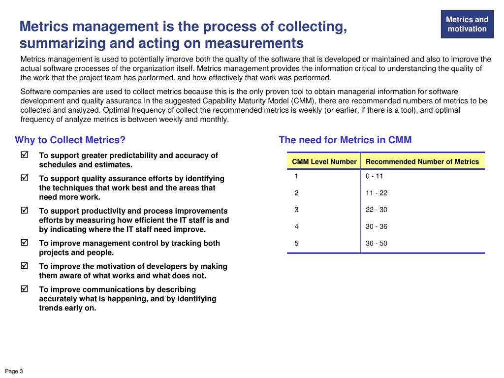 CMM Level Number Recommended Number of Metrics 1 2 3 4 5 0 - 11 11 - 22 22 - 30 30 - 36 36 - 50 Metrics and motivation Metrics management is the process of collecting, summarizing and acting on measurements Metrics management is used to potentially improve both the quality of the software that is developed or maintained and also to improve the actual software processes of the organization itself. Metrics management provides the information critical to understanding the quality of the work that the project team has performed, and how effectively that work was performed. Software companies are used to collect metrics because this is the only proven tool to obtain managerial information for software development and quality assurance In the suggested Capability Maturity Model (CMM), there are recommended numbers of metrics to be collected and analyzed. Optimal frequency of collect the recommended metrics is weekly (or earlier, if there is a tool), and optimal frequency of analyze metrics is between weekly and monthly. Why to Collect Metrics? The need for Metrics in CMM • To support greater predictability and accuracy of schedules and estimates. • To support quality assurance efforts by identifying the techniques that work best and the areas that need more work. • To support productivity and process improvements efforts by measuring how efficient the IT staff is and by indicating where the IT staff need improve. • To improve management control by tracking both projects and people. • To improve the motivation of developers by making them aware of what works and what does not. • To improve communications by describing accurately what is happening, and by identifying trends early on.
